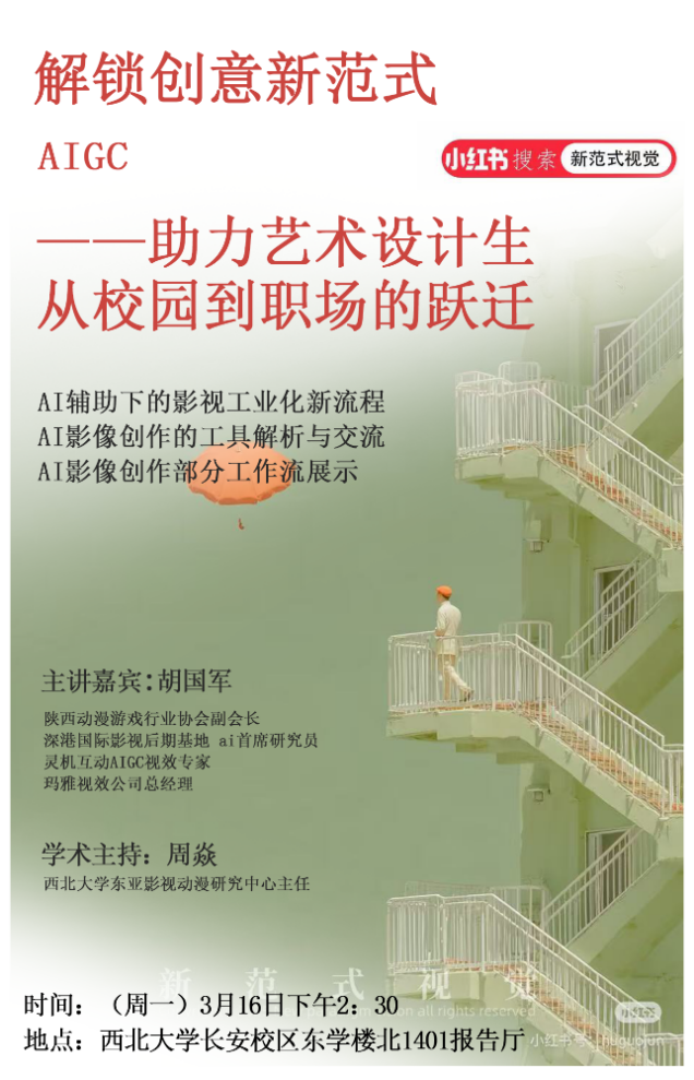 3月16日下午,西北大学艺术学院举办题为“解锁创意新范式:AIGC——助力艺术设计生从校园到职场的跃迁”的专题讲座。讲座特邀陕西动漫游戏行业协会副会长胡国军担任主讲。艺术学院陈欣书记致辞,东亚影视动漫研究中心主任周焱主持。